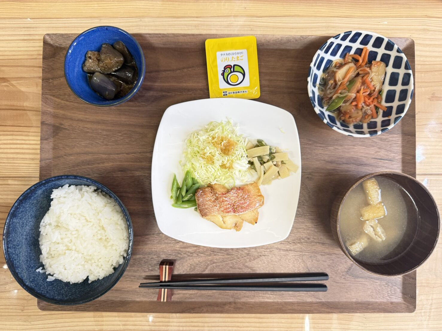 2025年9月30日 2025 9/30 食事 赤魚のゴマみりん漬け 糸こんにゃくとさつまあげの炒め 麻婆茄子風煮 たけのこの土佐煮オクラ和え ご飯 汁物 食事 2025年9月28日 2025年10月1日