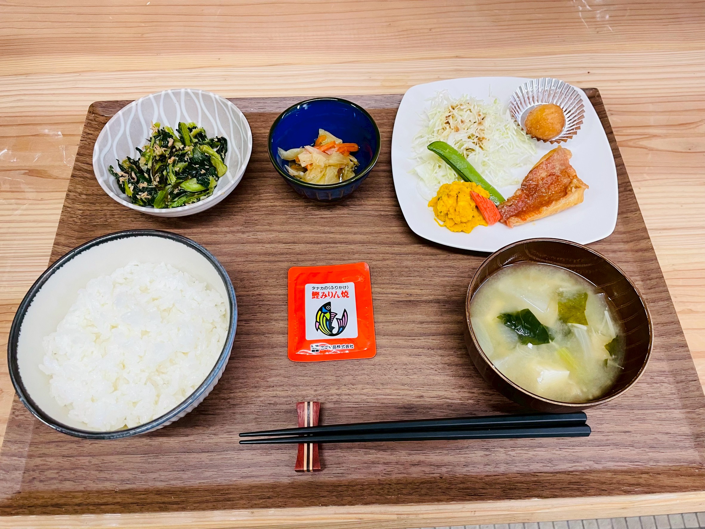 2025年10月10日 2025 10/10 食事 【昼食の献立】 赤魚のバター醤油焼き 小松菜の塩昆布ツナ和え かぼちゃサラダ キャベツ炒め ご飯 汁物 食事 2025年10月9日 2025年10月14日