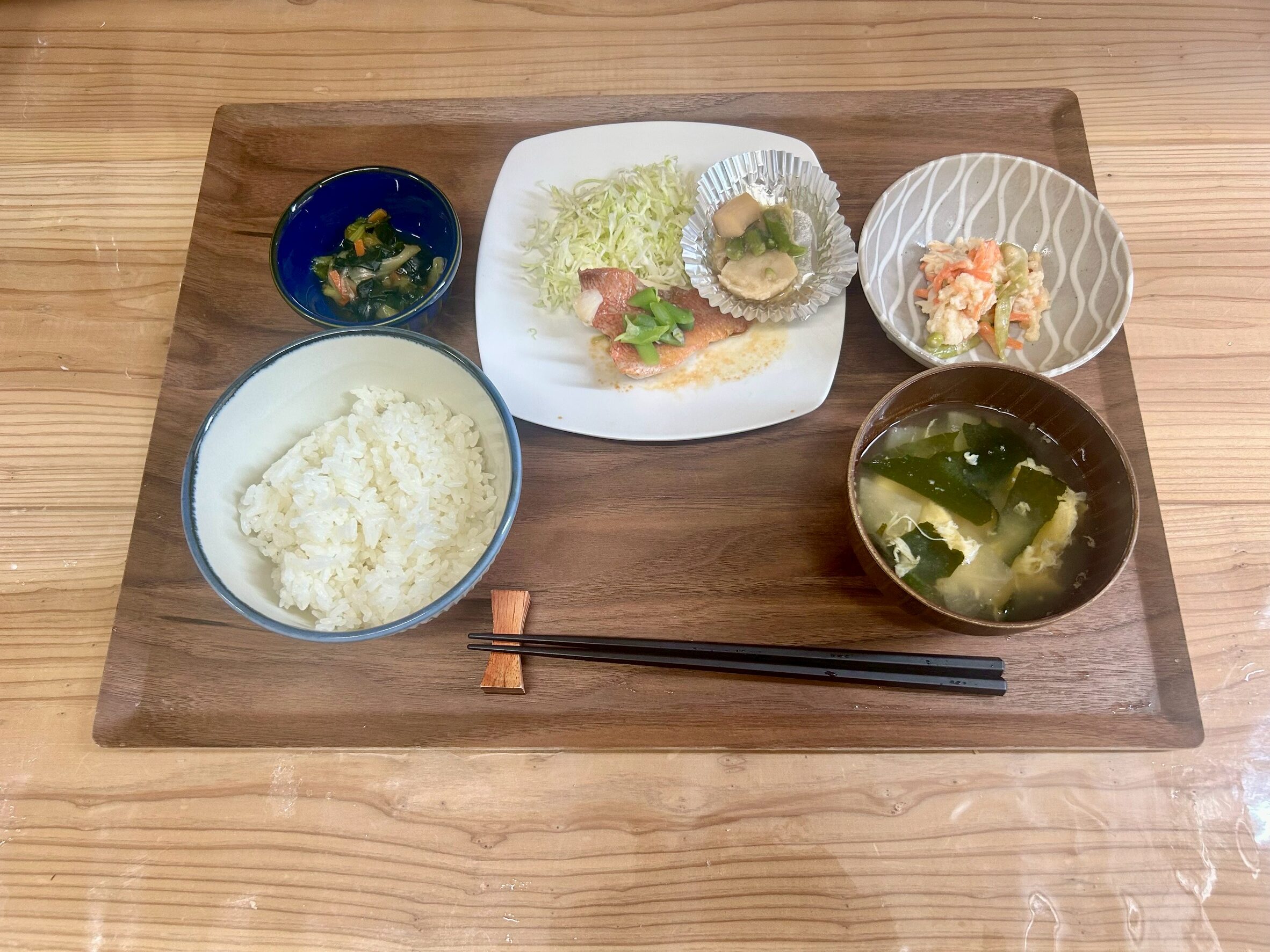 2025年10月14日 2025 10/15 食事 【昼食の献立】 赤魚のガーリック醤油ソース 蒸し鶏サラダ チンゲン菜の煮物 里芋とイカの煮物 ご飯 汁物 食事 2025年10月10日 2025年10月15日