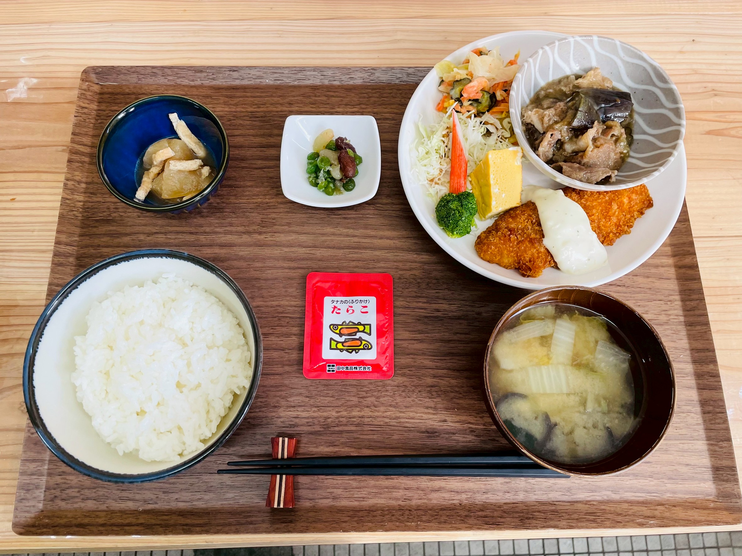 2025年12月6日 2025 12/08 食事 【昼食の献立】 茄子と豚肉のオイスターポン酢 ドレッシング和えサラダ 魚のフライタルタルソース 大根の煮物 ご飯 汁物 食事 2025年12月5日 2025年12月9日